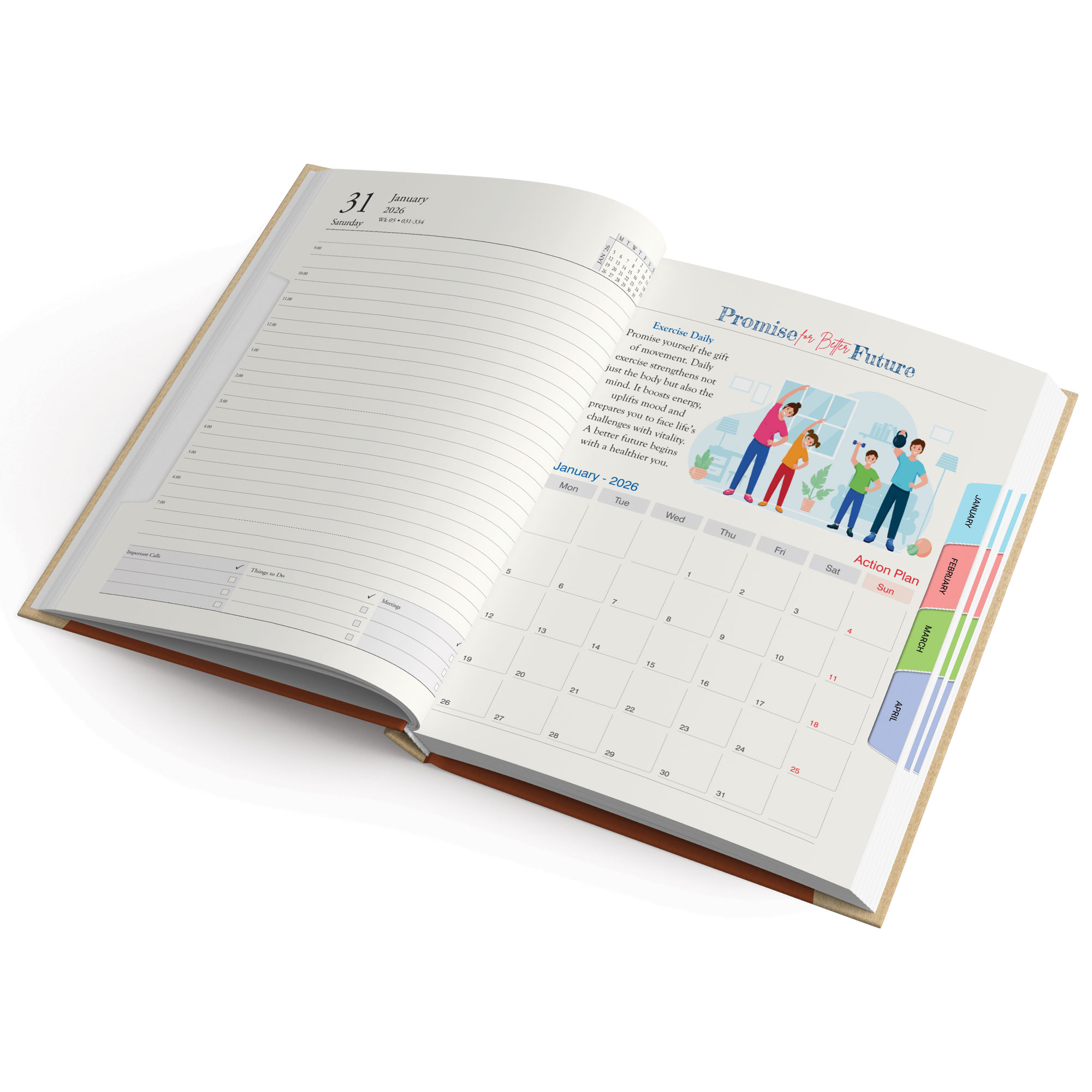 The 964 Promise For Better Future B5 Diary features a one-date-per-page layout with a vibrant colored theme planner and month tabbing, crafted on special natural shade paper for a smooth and comfortable writing experience.