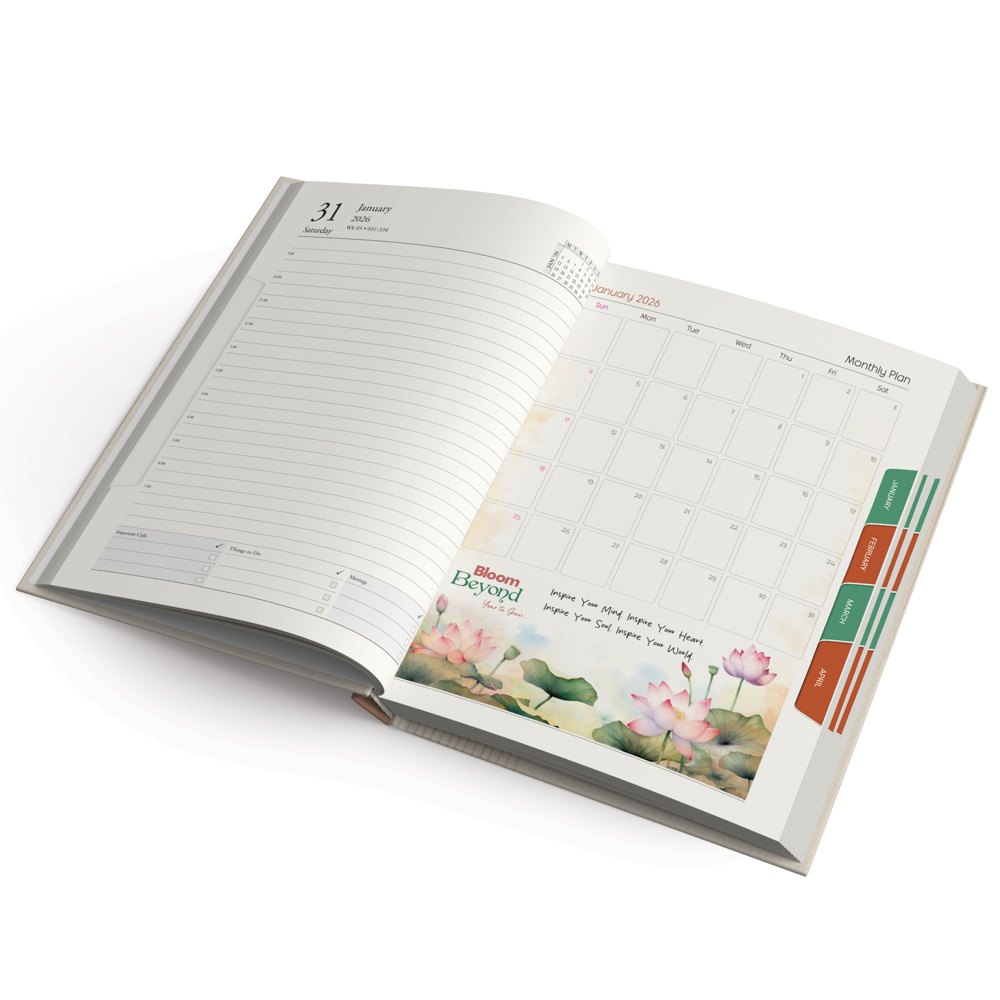 The 965 Bloom Beyond B5 Diary features a one-date-per-page layout with a colored theme planner and month tabbing for effortless daily scheduling.
